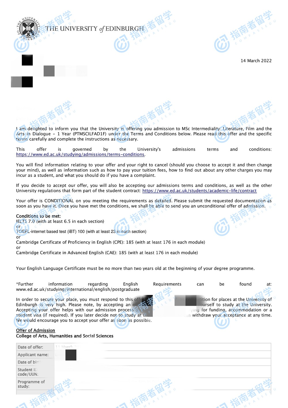 爱丁堡大学媒介间性:文学、电影与对话中的艺术理学硕士研究生offer一枚