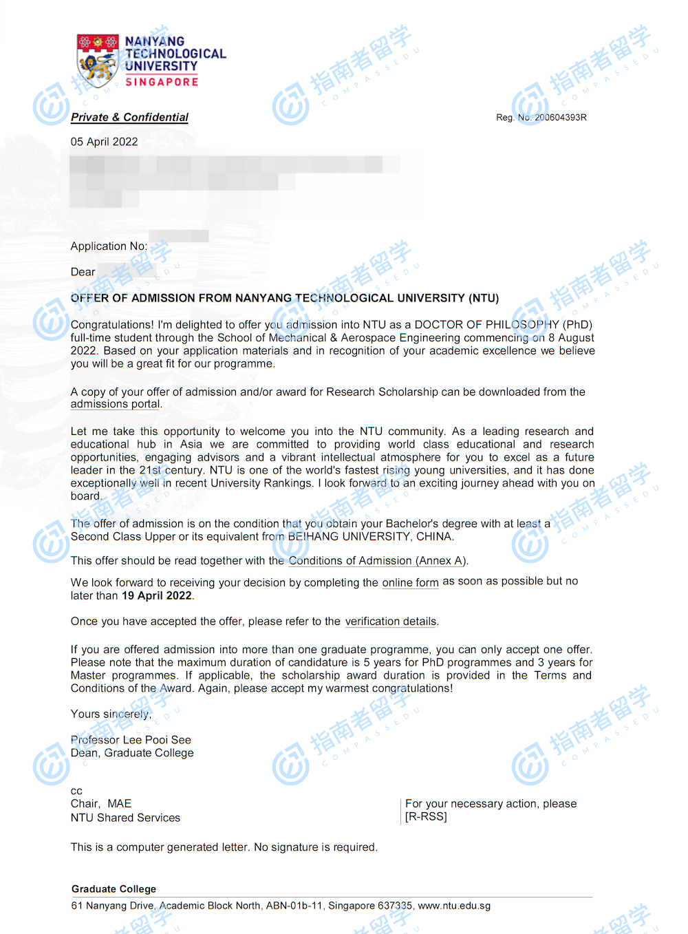 南洋理工大学PhD in School of Mechanical and Aerospace Engineering研究生offer一枚